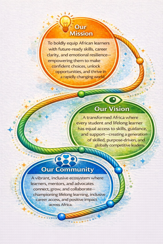 To become a trusted global platform that empowers African students and Lifelong learners to discover their strengths, build relevant skills and navigate clear, inclusive career pathways-fostering confidence, emotional well-being, and purposeful learning for a successful future.