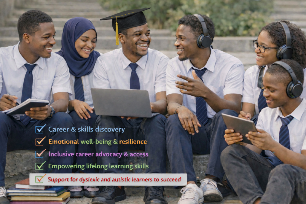 We help students and lifelong learners across Africa discover their strengths, explore career pathways, and grow holistically—combining skills development, emotional well-being, and inclusive support for lifelong empowerment.